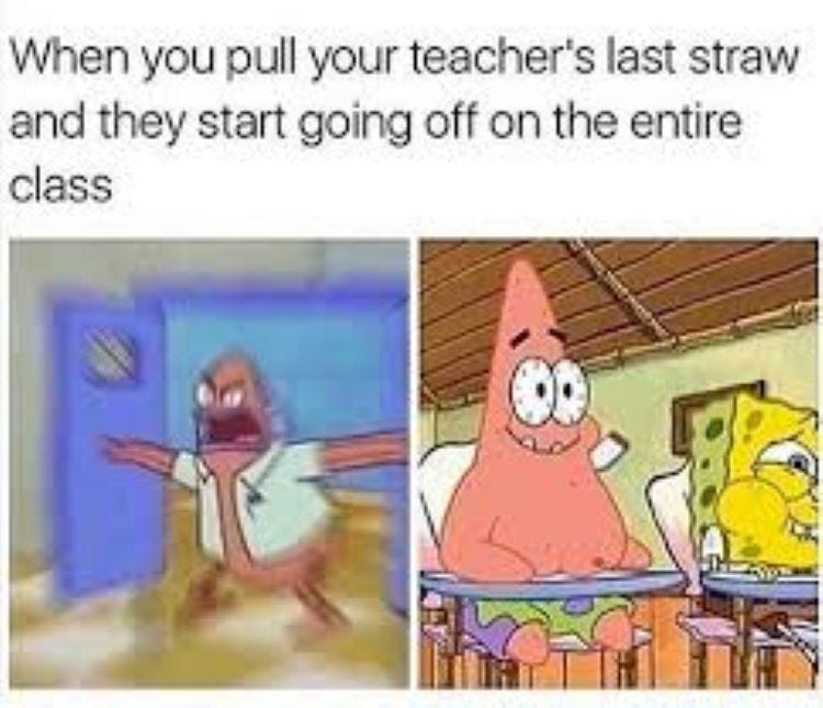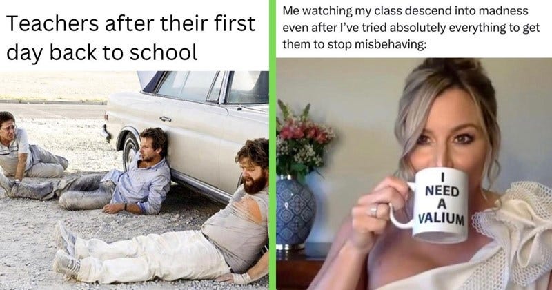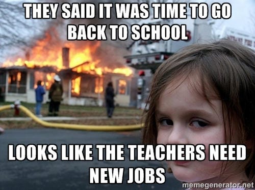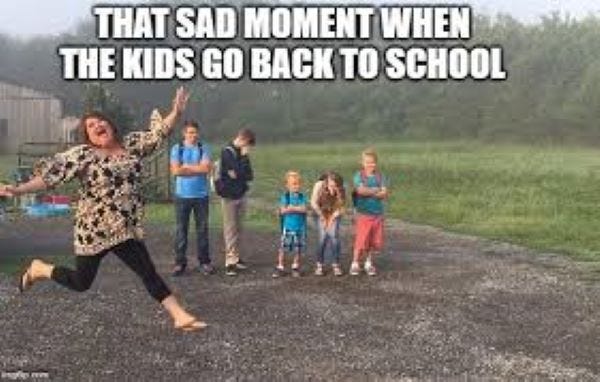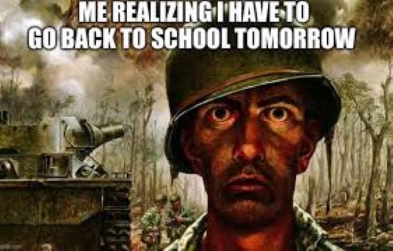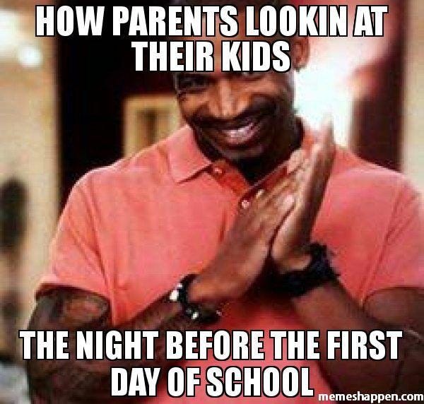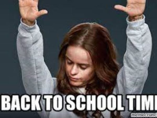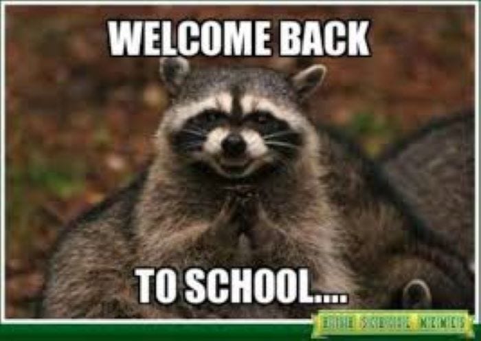 Ah, yes. It’s back to school season. When moms get drunk and take to the streets in a mostly peaceful protest….oh, wait. That’s a different story. Oh well. The moms and dads I know will be dancing in the streets because it’s time for those kiddos to rejoin their government prescribed propaganda-induced coma-like sit down and be quiet for the next 9 months camp, called school. You might LOVE it and they might hate it but some day they will look back with awe and nostalgia, mostly misremembered due to mind altering substances, at their school days as the “good ole days”. Everyone gets a turn wishing they knew then what they know now so I could bust that place wide open on a once in a lifetime joy ride to expulsion! Oh, sorry. You caught me monologuing. LOL. Anyhoo, it’s time for back to school memes. Get the champagne chillin peeps! 🎈