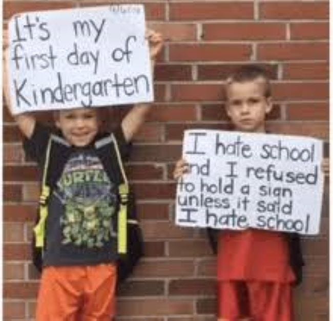 I still remember the trauma of being dropped off for Kindergarten. WHAT TF IS THIS!! as they shut the door. Nooooooooooooooooooooooooooooooooooooooooo!